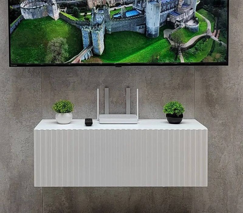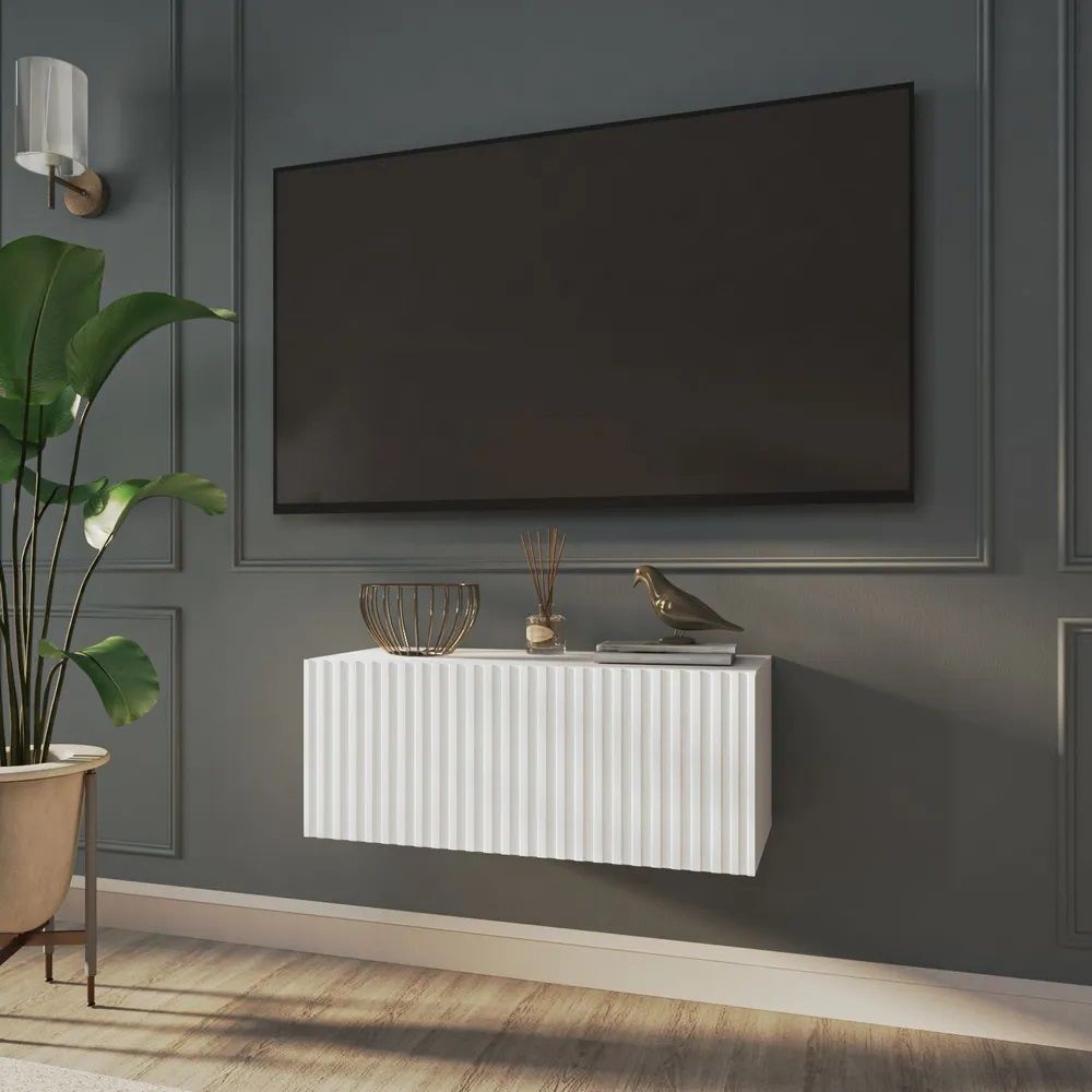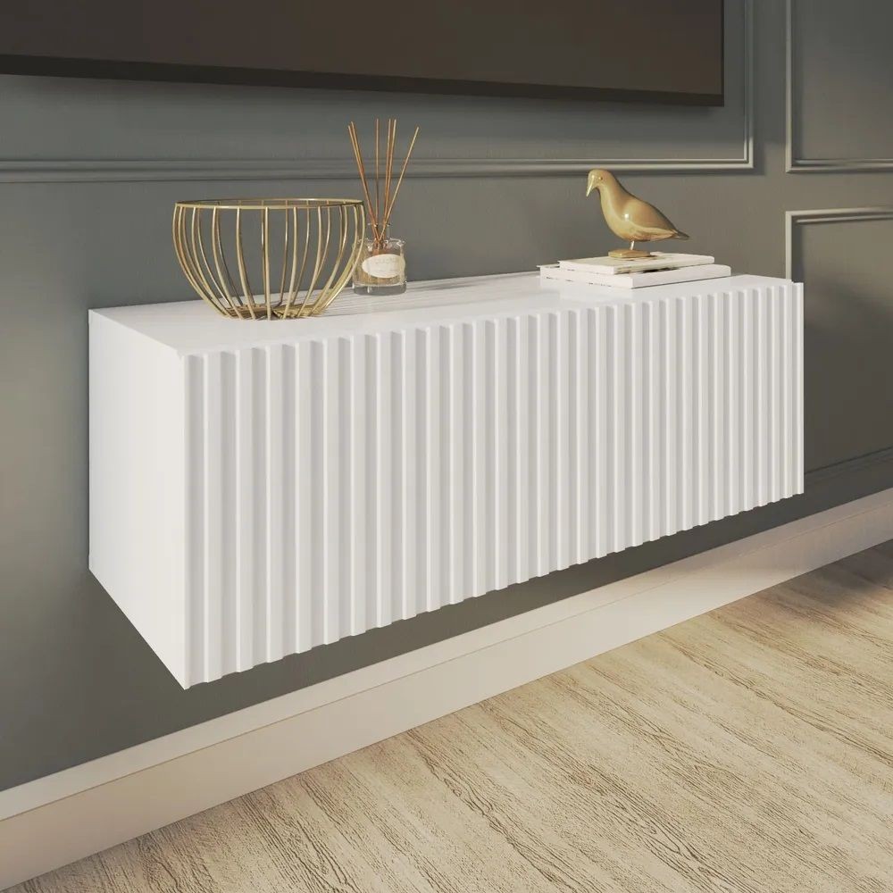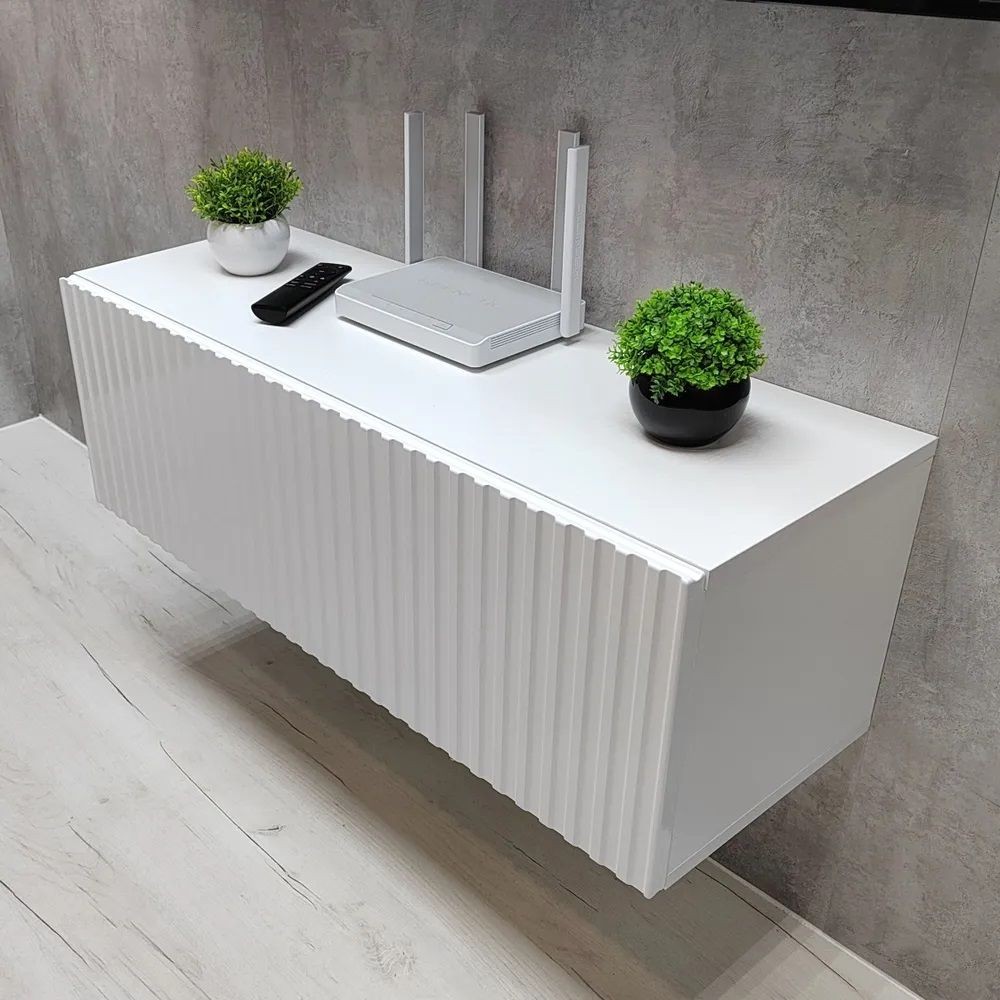 Благодаря своей компактности тумба под ТВ подвесная поможет сэкономить пространство, избежать ощущения загромождённости гостиной, спальни или детской комнаты, а рифлёный фасад будет акцентировать